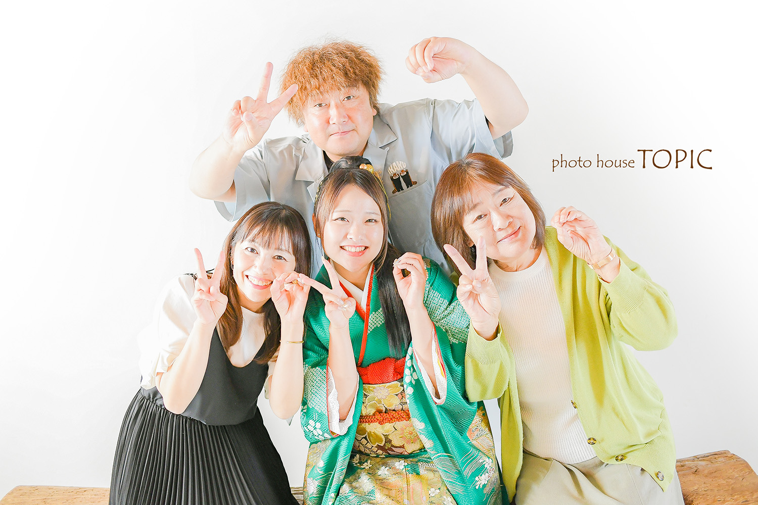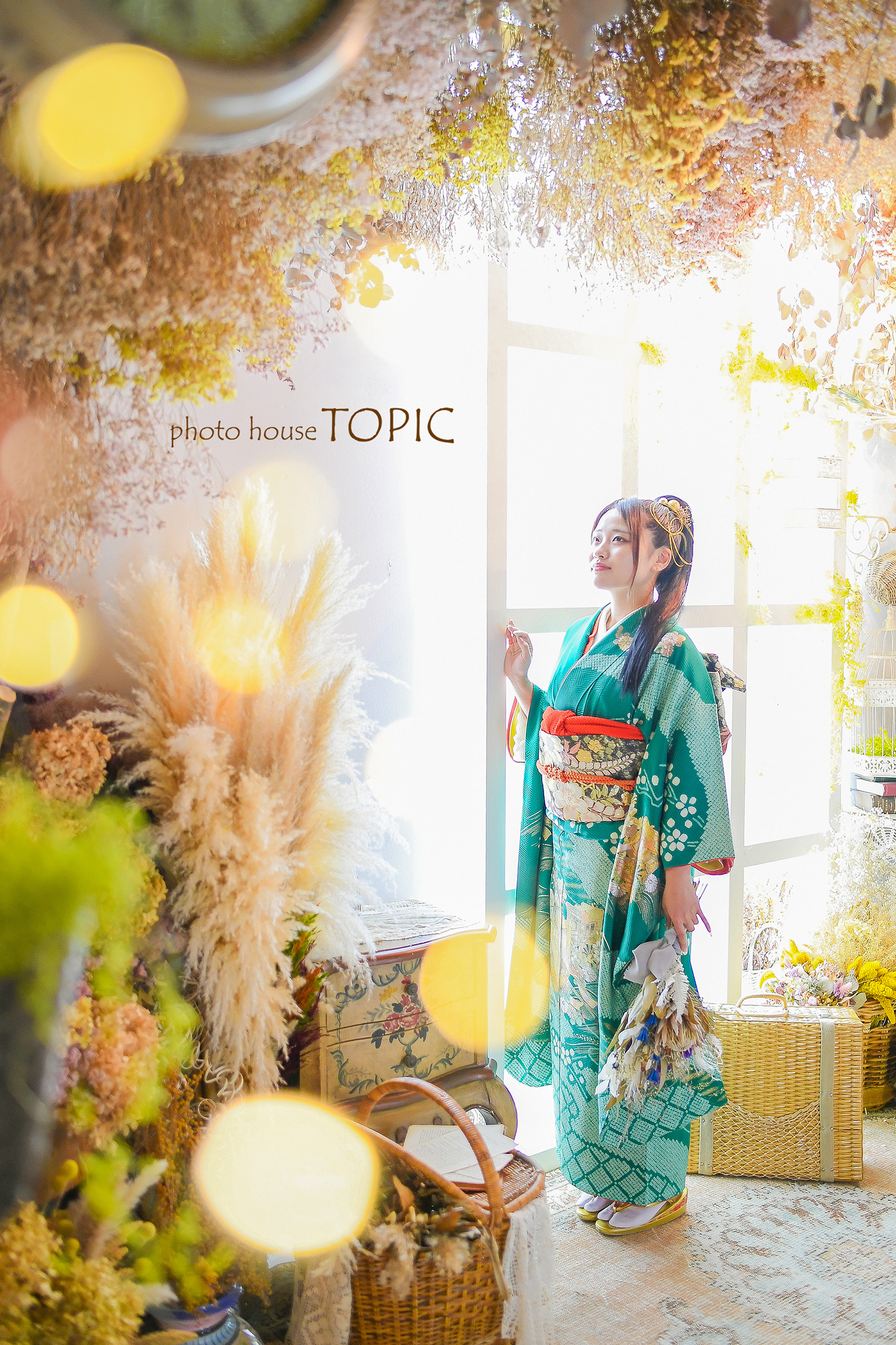 艶やかな緑の振袖をまとってぐっと大人っぽくなった表情に思わず見惚れてしまう。