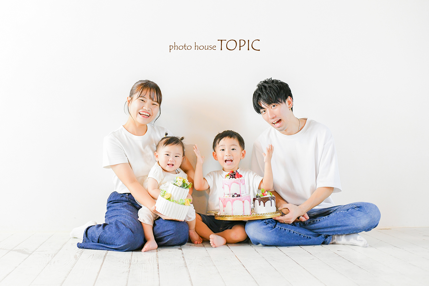 カラフルなケーキに囲まれて家族4人の賑やかであたたかい時間をお写真に^^